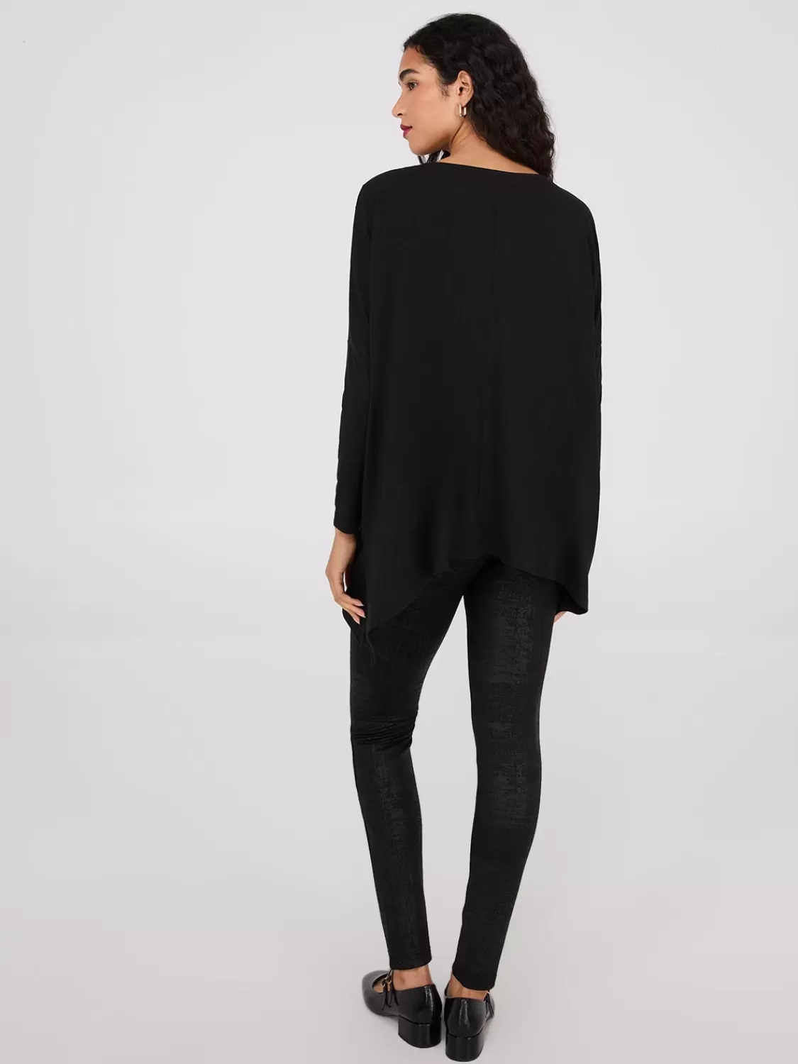 Stand out in any outfit with this tunic top, featuring rhinestone details and a handkerchief hem. Pair with faux leather leggings for the ultimate look.