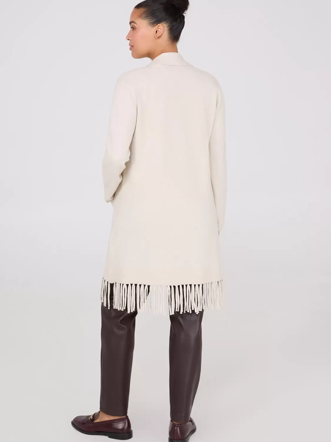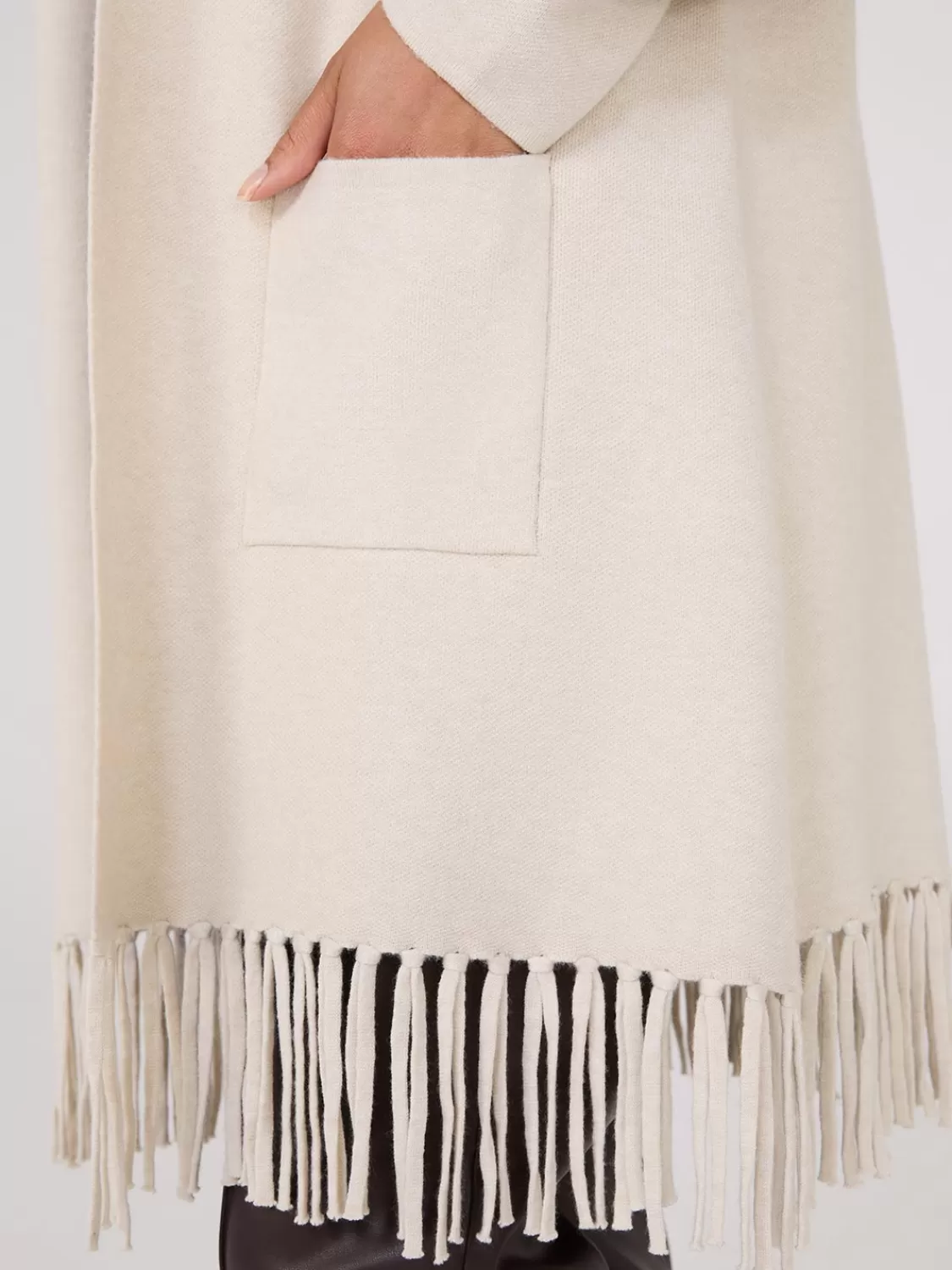 Add a fun fringe detail to your look with this shawl collar duster, perfect for adding a bohemian flair to your look.