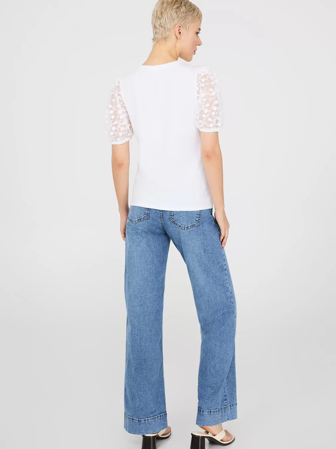 Perfect for day-to-night plans, our embroidered mesh sleeve t-shirt is a feminine piece that will become a summer staple.