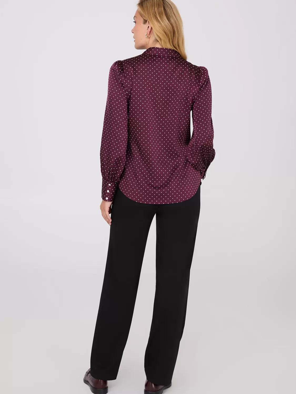 Our dot print satin button-front blouse has a new but subtle addition, with volume sleeves adding to the classic appeal of its professional silhouette.